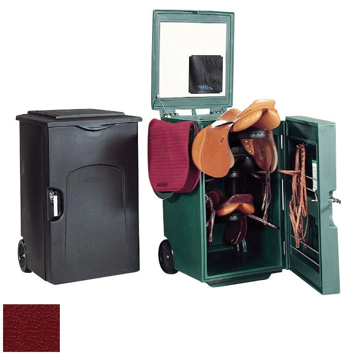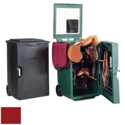 Burlingham Sports Saddle Trunk with large 10″ wheels for easy transport. The lockable lid flips up for access to a divided storage compartment that’s perfect for bandages, braiding supplies, or personal items. It has a dry erase board and pen, mirror, and a removable towel bar available to hang pads or towels. The lockable trunk fits up to two saddles plus there are two bridle racks and three hooks for strap goods. A third saddle rack attaches to the front of the trunk for cleaning or tacking up. Compartments inside the door allow for additional organized storage.
