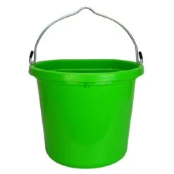 Fortiflex 20 qt plastic water bucket with a flat back. The flat back allows the bucket to lay flat against the wall and provide ample space for the horses head to fit comfortably to drink.