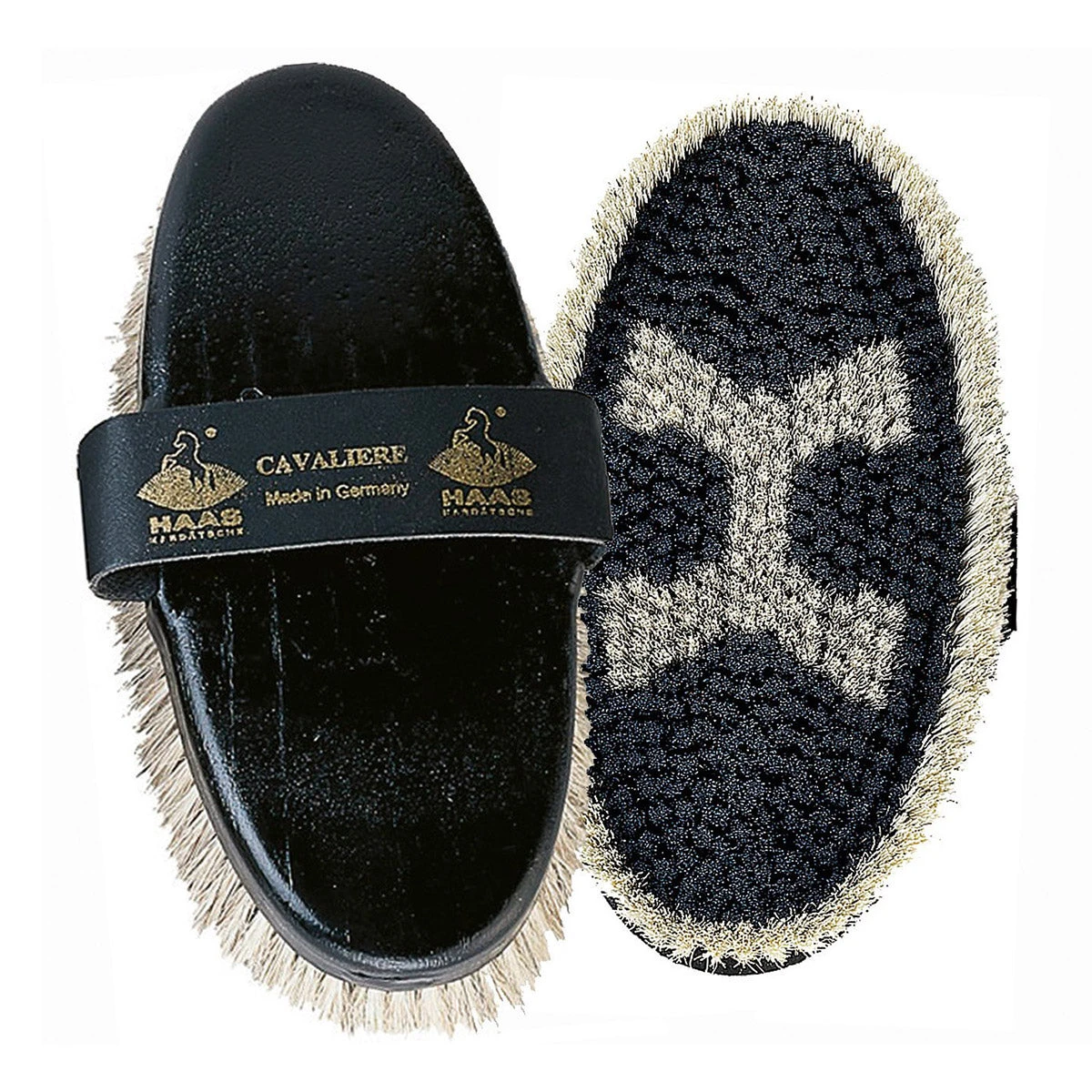 The #1-selling Haas brush! This quality, stylish brush is engineered to last for years and create a dazzling finish. Made with genuine horse hair and durable resin base create a body brush that is sure to lift dirt, loose hairs, and dander from your horse’s coat. A comfortable leather hand strap is cleverly incorporated into the body of the brush, avoiding the use of nails or glue for increased longevity and prevents injury to horse or rider. The slightly raised edges of the longer border maximize cleaning results, revealing a soft, shiny coat. Use after your favorite Haas curry and before your Haas Diva Brush for a blue-ribbon turnout! Made in Germany.