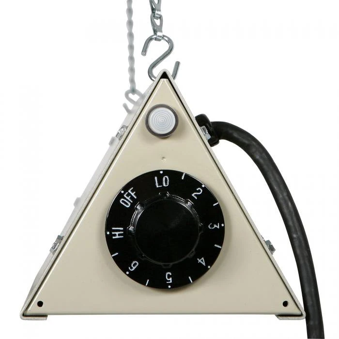 - Equipped with 7 ft. double insulated cordset w/ molded grounded plug, 13 ft hanging sash chain (to be cut in half for up to 6 1/2 ft. suspension), and hanging hardware consisting of woodscrew hooks and “S” hooks. Close the “S” hooks with pliers for secure hanging. The heaters are typically hung much like a fluorescent light fixture, although wall mounting is possible.