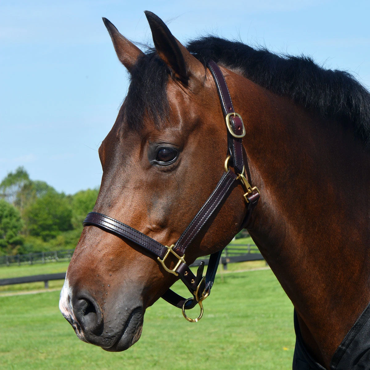 #1 Selling Quiet Creek Leather Products Triple Stitched Leather Halter is made from premium handcrafted oil stained leather in the heart of Amish country. This top of the line 1″ wide leather halter features hand burnished edges, solid brass hardware, double adjustable crown, adjustable chin and rolled throat latch with snap. Matches perfectly with Quiet Creek’s 6′ Leather Lead #45L making it a perfect choice for shows, awards and as sale halters. Add a custom nameplate for a winning combination!