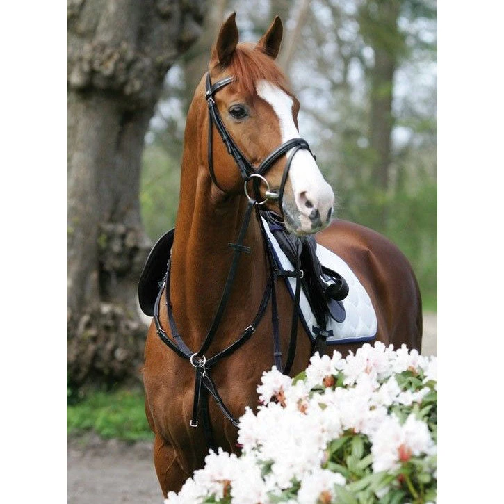 Modern breastplate incorporates a quick disconnect running attachment for easy and quick handling. Breastplate fastens onto the billets on both sides of the horse ensuring a steadier position of the saddle and relieving the load from the breastplate rings. By relieving this load the horse’s freedom of movement over the jump is optimized. Ideal for hunter/jumper, eventing and cross country riding.